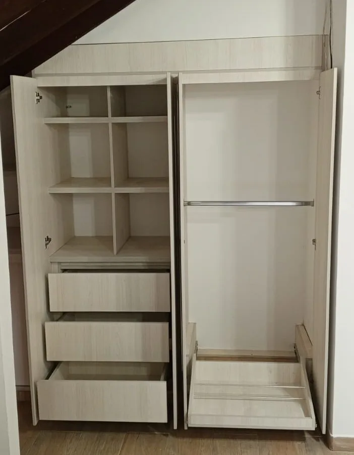 Closet pequeño elaborado en madecor RH con 4 puertas de apertura abatible, espacio para colgadero de ropa, entrepaños, cajones y zapatero.